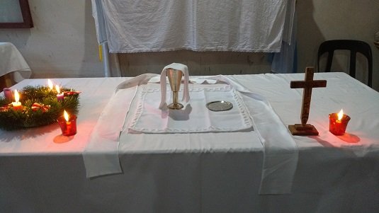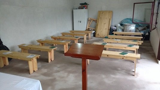 Los misioneros colaboramos con materiales de construcción y equipando la Capilla con un Altar, un ambón, bancas, vasos y paños sagrados para el Altar, una campana, un Sagrario.